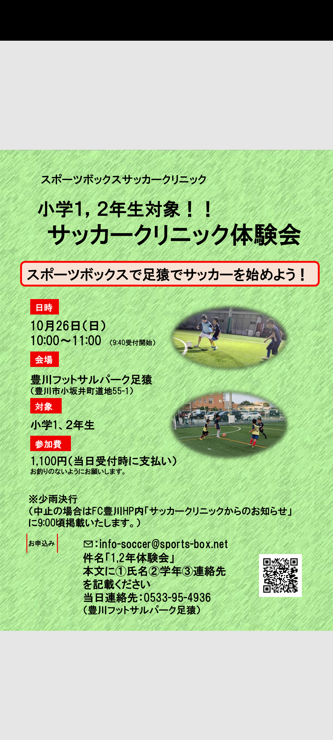2025/09/24 小1、小2サッカークリニック体験会!! サッカークリニック体験会! 1、2年生のクリニック体験会を行います! ふかふかの足猿の人工芝で楽しくサッカー始めてみませんか? 楽しくサッカーをするにはここが一番! ぜひ気軽に申し込みください!