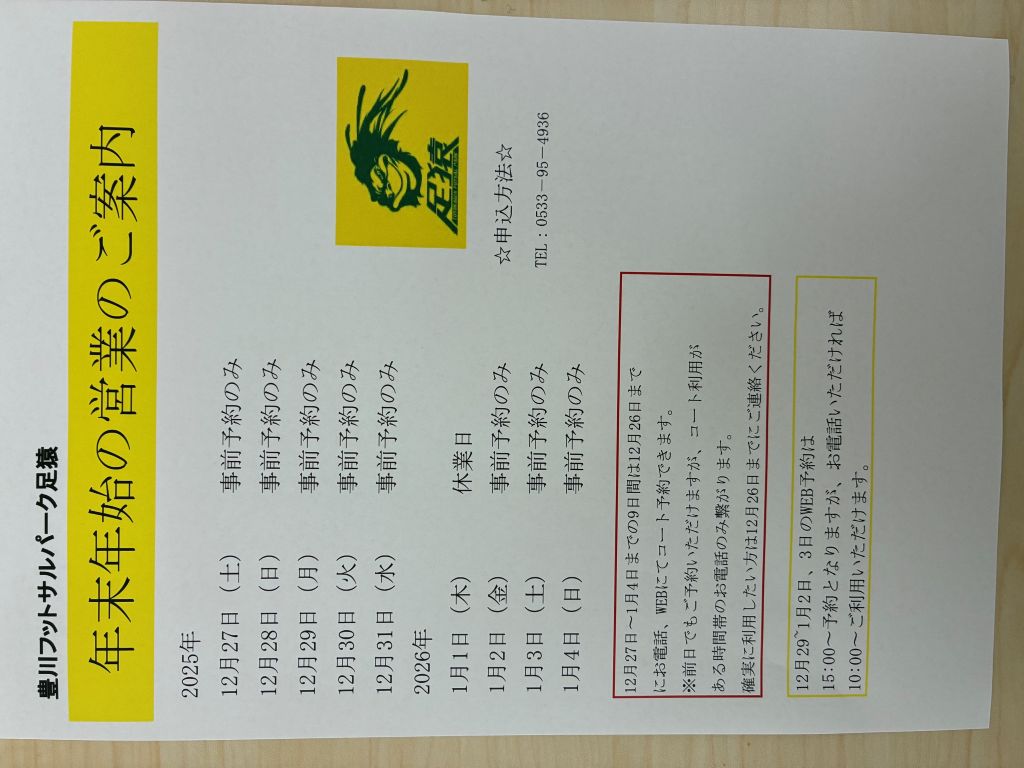 2025/12/16 年末年始営業のお知らせ 年末年始営業時間のお知らせです! 12/27〜1/4は事前予約のみとなります(^^)/ 1/1は休業日となります! 年末年始にご利用希望の方はお早めにご予約ください(^_-)-☆ 現時点で全てのコート埋まっている日時もございます!(^^)! たくさんのご利用お待ちしております(#^^#)