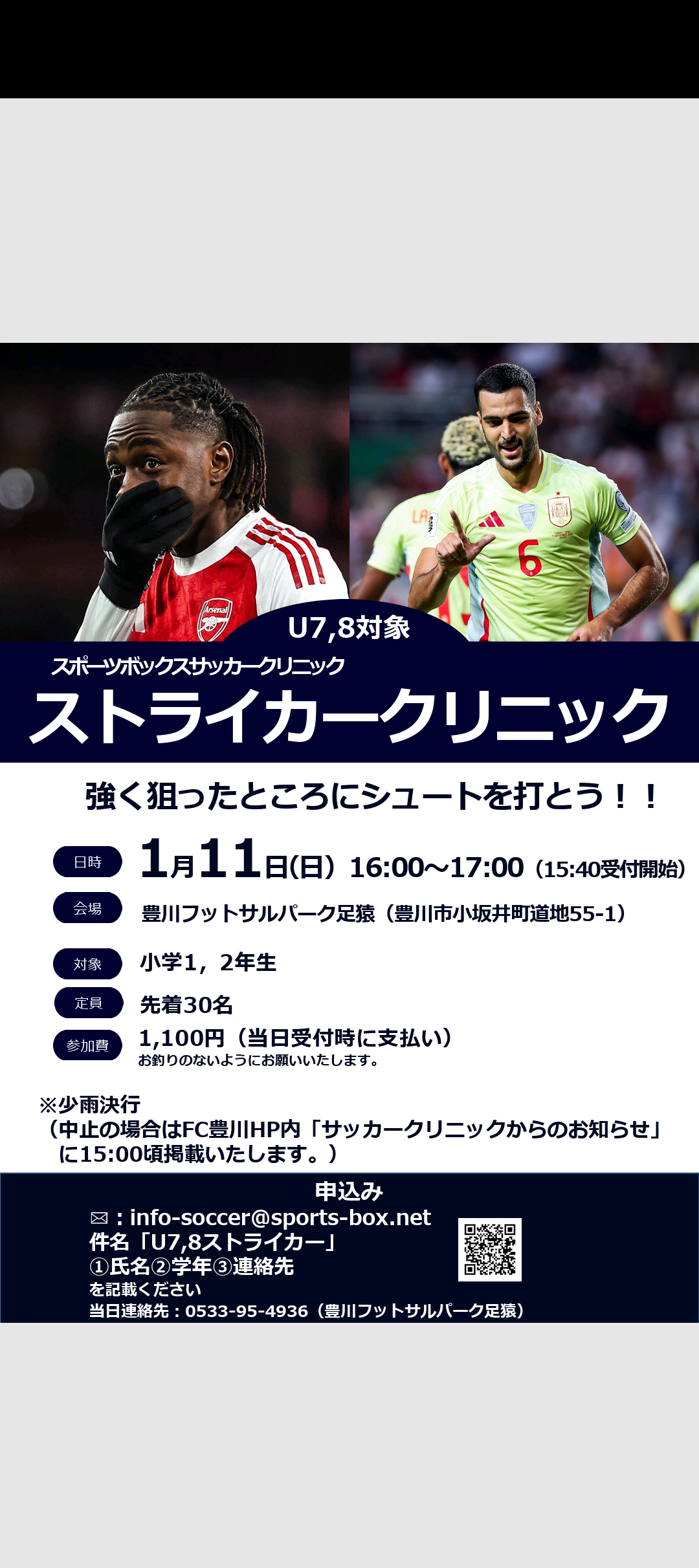 2025/12/17 U7,8ストライカークリニック U7,8ストライカークリニック!! 好評ストライカークリニックが久しぶりの開催! 強いシュートを決められるコツを掴もう! 上手くなりたい選手はぜひ! 詳細は画像をご覧ください ご参加お待ちしております!
