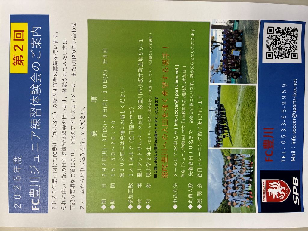足猿を拠点に活動しているFC豊川ジュニア新3年生の第2回体験会が2/2〜行われます!